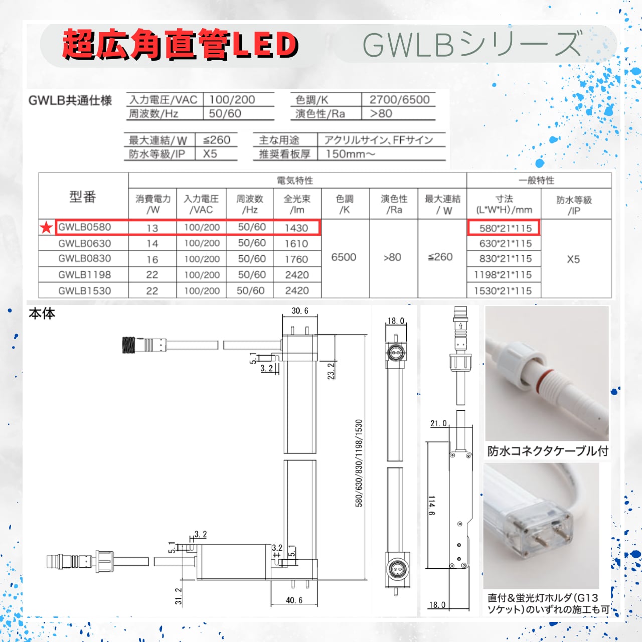 “内照/行灯用 超広角直管LEDバー” 20W型(L=580) GWLBシリーズ